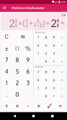 Miks leppida ainult vastusega, kui saad aru kogu lahenduskäigust? **Lahenduseta fraktsioonikalkulaator** eristub oma detailsete samm-sammult lahenduste poolest, mis demonstreerivad iga arvutuse loogikat ja metoodikat. Lisaks põhilistele liitmis-, lahutamis-, korrutamis- ja jagamistoimingutele saad murdudega arvutada ka protsente, laiendades oluliselt oma matemaatilisi võimalusi. Kõik sinu varasemad arvutused on mugavalt ajaloo all salvestatud, et saaksid neid igal ajal uuesti vaadata. Ja et kasutuskogemus oleks veelgi personaalsem, oleme loonud rakenduse mitmes värvitoonis, et saaksid valida endale meelepäraseima.