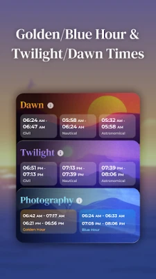 Avasta taevase maailma rütmid rakendusega Moon Phases & Sun Calendar, sinu personaalseks teejuhiks Kuu ja Päikese dünaamilises tantsus. See ainulaadne rakendus koondab ühte mugavasse kohta kõik vajalikud andmed – alates detailsetest kuufaaside ülevaadetest ja päikese asukohtadest kuni kuldse ja sinise tunni täpsete aegadeni. Olgu sinu kireks astroloogia, loodusfotograafia või lihtsalt soov mõista paremini taevaseid sündmusi, Moon Phases & Sun Calendar pakub usaldusväärset ja intuitiivset teavet mis tahes kuupäeva ja asukoha kohta. Lihtne kasutada, ent rikkalik detailides, see on sinu värav igapäevaseks ühenduseks kosmosega.