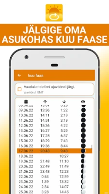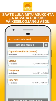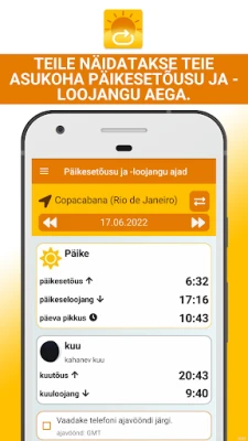 Lisaks päikesele pakub rakendus põhjalikku teavet ka kuu kohta, kuvades kuu tõusu ja loojangu ajad. Kohandatavad igapäevased märguanded aitavad teil sündmusi ette planeerida, andes teada, millal on õige aeg valmistuda. Looge oma lemmikkohtade loend, et kiiresti ligi pääseda kõige olulisematele andmetele, hoides kõik teie olulised paigad hõlpsasti ligipääsetavas kohas. "Päikesetõusu ja päikeseloojangu rakendus" on teie usaldusväärne kaaslane, et püsida alati kursis päikese ja kuu dünaamikaga.